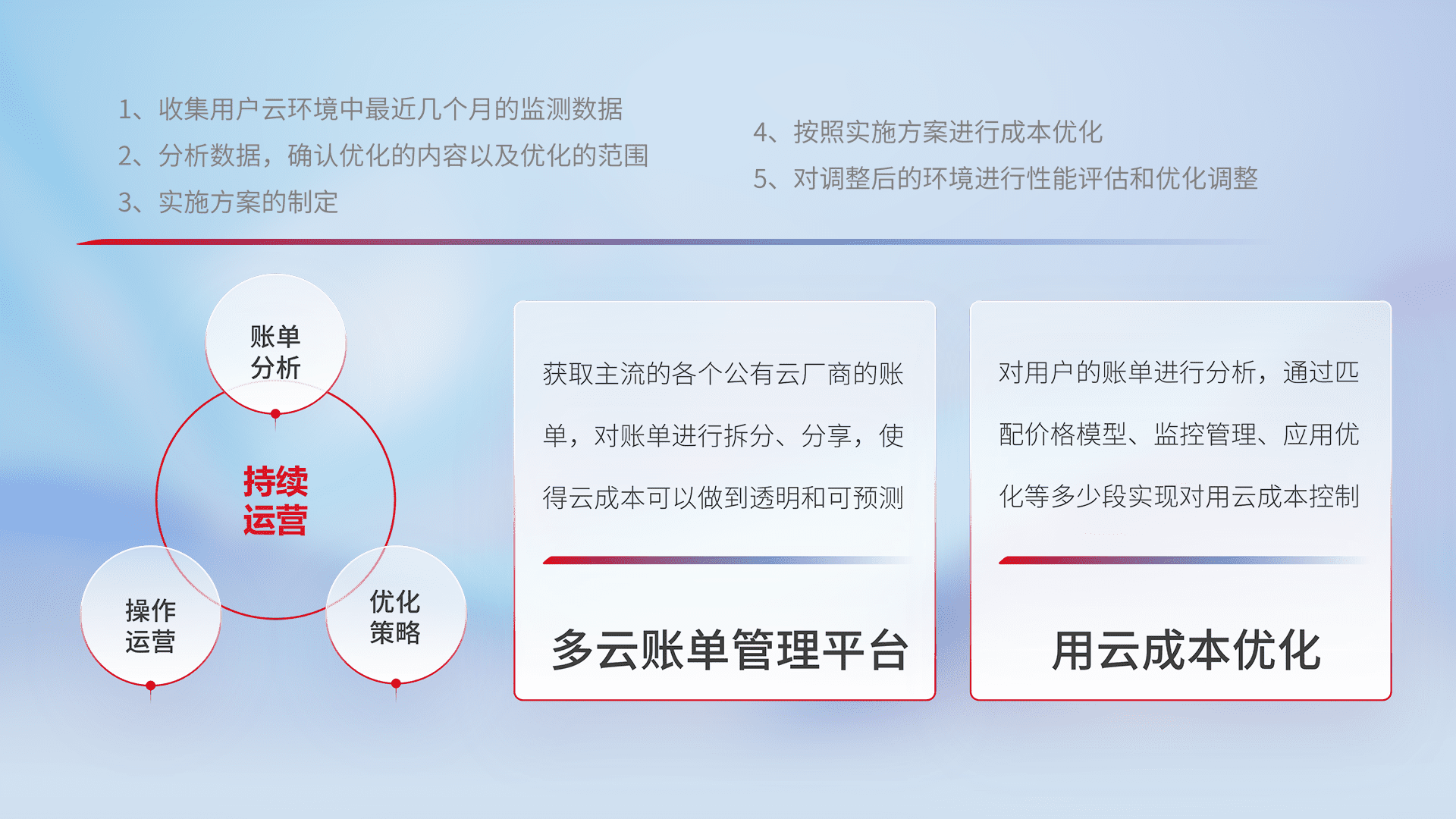 通过多云纳管,,,,以统一的资源数据模型把客户的云资源进行抽象和封装,,,,进而实现对多云资源的统一操作,,,保障云资源管理的可靠性、、、稳定性与可用性。。。量身定制化运维内容,,,配置、、、开发运维、、补丁管理、、备份、、监控、、认证和访问管理、、审计和日常巡检等,,,保障在用云过程中的可靠度,,,,稳定度以及高可用率。。