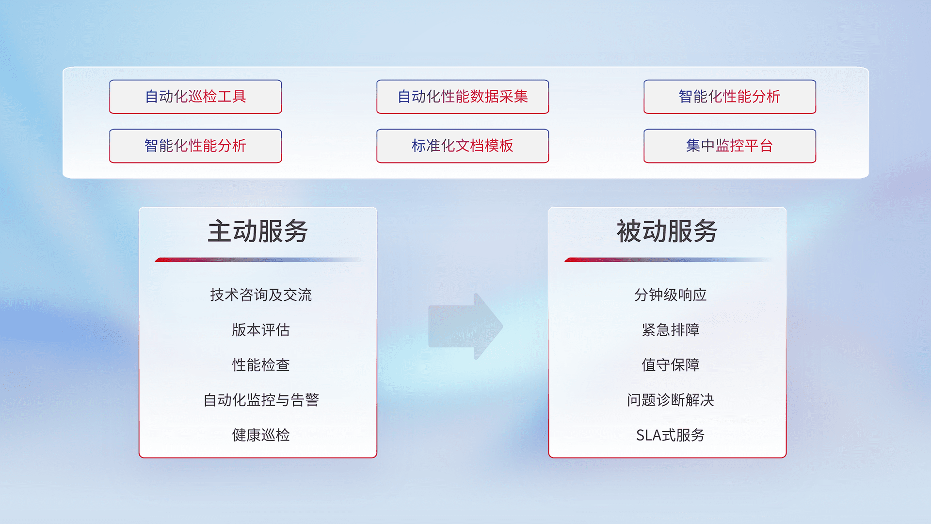 智能化工具和标准化文档,,,,保障服务质量,,,提供主动服务(包含技术咨询、、、版本评估、、、、性能检查、、、、自动化监控与告警、、、、健康巡检)和被动服务包含(分钟级响应、、、紧急排障、、、值守保障、、、、问题诊断解决、、、、SLA服务)。。